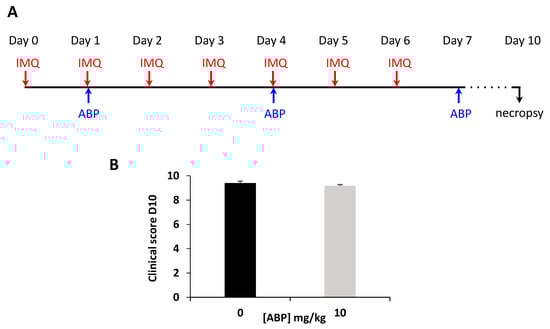 Clinical assessment of the efficacy of the ABP dendrimer when administered intravenously to imiquimod (IMQ)-induced psoriatic mice. (A) Time line of the study. (B) Clinical score at day 10 for control psoriatic mice (black bar) and mice treated with 10 mg/kg of the ABP dendrimer every 3 days (n = 10 mice in each group).
