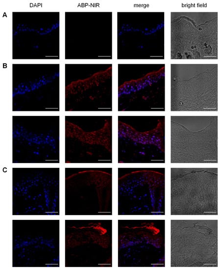 The ex vivo study of the penetration of dendrimers on IMQ-induced psoriatic skins was conducted using Franz diffusion cells with a diffusion area of 1.77 cm2 (PermeGear, Hellertown, PA, USA). The induction of psoriatic skin by IMQ on the back of mice was achieved as described above. After 5 or 7 days, we sacrificed the animals, and the diseased skin of the back was excised and stored at −80 °C until use. Before the permeation experiment, we thawed the skins to room temperature and then mounted them between the donor and receptor compartments of the Franz diffusion cell with the SC facing the donor compartment. The near infra-red fluorescent analogue (ABP-NIR) of the ABP dendrimer was used for visualizing its penetration in the diseased skin. A solution of the ABP-NIR dendrimer in PBS with a concentration corresponding to the dose of 50 mg/kg was prepared and deposited all over each skin in the donor compartment. A control assay was performed with deposition of PBS on the skin from the back of mice to establish the normal fluorescence of the tissues. The receptor compartment was filled with 12 mL PBS and stirred at 300 rpm. After a 24 h incubation at a temperature of 37 ± 1 °C, we removed the skins and carefully washed them with PBS, and then froze them at −80 °C in an optimal cutting-temperature compound (isopentan). We then cut 10 µm thick cryo-sections from the skin samples using a cryostat (CM1950, Leica, Wetzlar, Germany), and we mounted them using ProLong Gold anti-fade reagent with DAPI (4’,6-diamidino-2-phenylindole; Invitrogen, Thermo Fischer Scientific, Waltham, MA, USA) for nuclear staining. Images of 512 × 512 pixels were acquired with a 63X immersion objective on a Leica SP8 confocal microscope. For the detection of the ABP-NIR dendrimer, the excitation wavelength was 635 nm and the emission wavelengths were between 650 and 800 nm. Images were processed using ImageJ software.