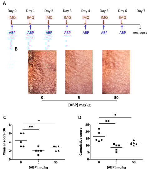 Clinical assessment of the efficacy of the ABP dendrimer when administered topically to IMQ-induced psoriatic mice. (A) Time line of the study. (B) Representative pictures of the skin of the back of mice. On the left, control psoriatic mouse; in the middle and on the right, mouse treated daily with 5 mg/kg and 50 mg/kg of the ABP dendrimer, respectively. (C) Clinical score at day 6 for each group of mice (n = 5 mice in the control group at a concentration of ABP = 0 mg/kg, n = 5 mice for the group at 5 mg/kg, and n = 6 mice for the group at 50 mg/kg). (D) Cumulative clinical score from day 1 to day 7 for each group of mice. * p < 0.05, and ** p < 0.01 versus untreated mice (concentration of ABP = 0 mg/kg) using the one-way ANOVA test followed by the post hoc Dunnett’s test.