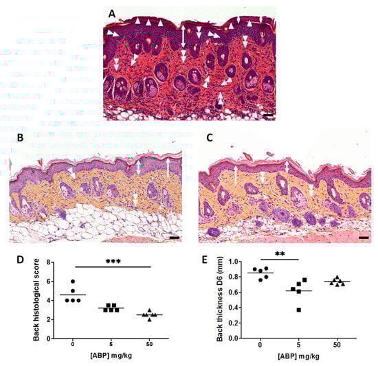 Histological assessment of the efficacy of the ABP dendrimer when administered topically to IMQ-induced psoriatic mice. Representative pictures of the skin of the back of mice stained with hematoxylin/eosin at day 7 from psoriatic control mouse (representative of n = 5 mice) (A), and from mice treated daily with 5 mg/kg (representative of n = 5 mice) (B) and 50 mg/kg (representative of n = 6 mice) (C) of the ABP dendrimer; black scale bars represent 50 µm. Single-headed arrows point the granular layer (absent in (A)), double-headed arrows show acanthosis, single arrow heads show parakeratosis (lowered in (B) and (C)), diamonds show hyperkeratosis (lowered in (B) and (C)), double arrow heads show infiltration of immune cells. (D) Scoring of the histological assessment of the skin of the back for each group of mice; *** p < 0.001 versus untreated mice (concentration of ABP = 0 mg/kg) using the Kruskal–Wallis’ test followed by the post hoc Dunn’s test. (E) Measurement of the thickness of the skin of the back for each group of mice at day 6; ** p < 0.01 versus untreated mice (concentration of ABP = 0 mg/kg) using the Kruskal–Wallis’ test followed by the post hoc Dunn’s test.
