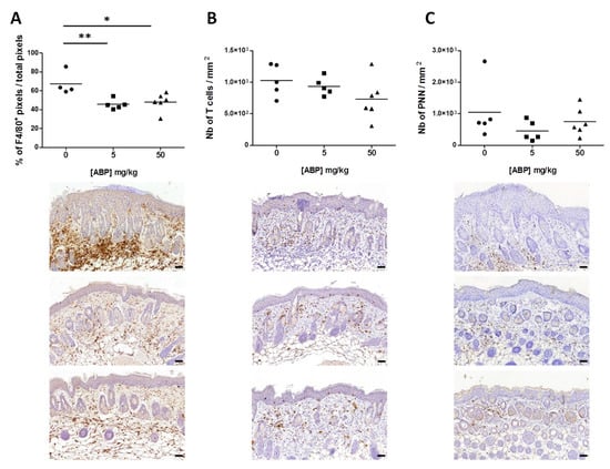 Immunological assessment of the efficacy of the ABP dendrimer when administered topically to IMQ-induced psoriatic mice. Quantification of the infiltration of F4/80-positive cells (mainly macrophages) (A), T lymphocytes (B), and polynuclear neutrophils (C) in the skin of the back of each group of mice (n = 5 mice in the control group at a concentration of ABP = 0 mg/kg, n = 5 mice for the group at 5 mg/kg, and n = 6 mice for the group at 50 mg/kg) by immunohistochemistry; * p < 0.05, and ** p < 0.01 versus untreated mice (concentration of ABP = 0 mg/kg) using the one-way ANOVA test followed by the post hoc Dunnett’s test. Below each graph, representative immunochemistry pictures of the skin of the back of mice at day 7 from psoriatic control mouse, and mice treated daily with 5 mg/kg and 50 mg/kg of the ABP dendrimer, from top to bottom, respectively, are shown; black scale bars represent 50 µm.