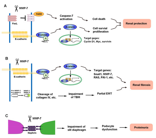 The mechanisms of MMP-7 action in kidney disease. (A) In renal tubular epithelial cells, MMP-7 promotes cell proliferation and reduces cell death by degrading E-cadherin and FasL, respectively, and finally plays a role in protecting the kidney during acute kidney injury (AKI). (B) However, MMP-7 also degrades E-cadherin and activates proMMP-2 and -9, leading to renal fibrosis. (C) In podocytes, MMP-7-mediated degradation of nephrin impairs the integrity of the slit diaphragm, which subsequently causes an increase in proteinuria and eventually leads to renal fibrosis.