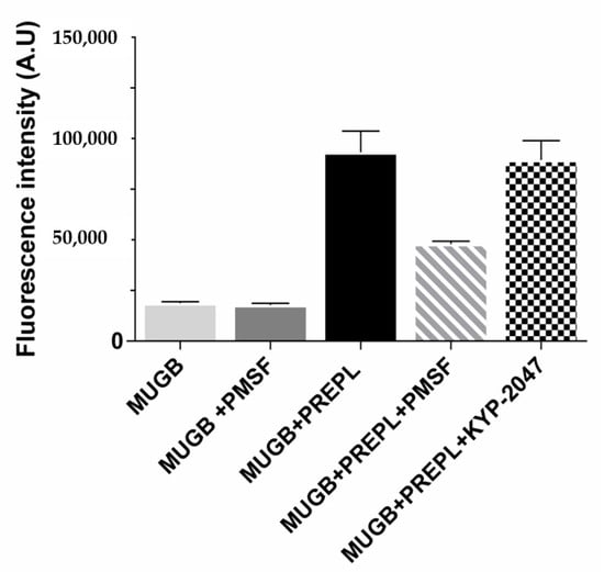 Prolyl endopeptidase-like (PREPL) enzymatic activity assays using 4-guanidinobenzoic acid 4-methylumbelliferyl ester hydrochloride (MUGB) as substrate. Fluorescence intensity (λEX = 320 nm, λEM = 460 nm) increased with MUGB ester bond hydrolysis. MUGB hydrolysis by PREPL was inhibited by phenylmethylsulfonyl fluoride (PMSF) (50%) but not by KYP-2047.