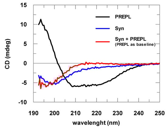Changes in the UV CD spectra obtained before and after addition of α-Syn to PREPL clearly show the binding between these two proteins (Figure 2). If no binding occurred, both spectra (α-Syn alone or mixed with PREPL) represented by the red and blue lines would be identical. A possible interpretation for the changes visualized in this CD analysis can be made assuming that, as the α-Syn is an intrinsically disordered protein, while PREPL is a well-folded large protein, the variations of the UV CD spectra may mainly represent changes of the α-Syn structure. However, it cannot be discarded that PREPL may have also structural modifications upon α-Syn binding, which also account for the spectra differences shown in Figure 2. Nevertheless, although no quantitative data can be taken from these spectra obtained from PREPL+ α-Syn mixtures, it is quite clear that a conformational change (including secondary structural variations) is coupled with the binding of these two proteins.