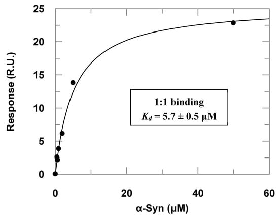 Dose–response data obtained in the surface plasmon resonance (SPR) assays with immobilized PREPL and α-Syn as the analyte injected at increasing concentrations (the correspondent adjusted sensorgrams are presented in the Supplementary Materials, Figure S3). The symbols represent the response in resonance units (RU) determined experimentally at each concentration of injected α-Syn, and the line is a fitted curve according to Equation (1).