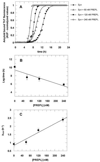 The results presented in Figure 4 show that α-Syn aggregates faster in the presence of PREPL. Figure 4A shows the time course of the α-Syn aggregation, followed by the increasing of amyloid-bound ThT fluorescence, in the absence and in the presence of increasing concentrations of PREPL. Each obtained dataset was fitted to Equation (2) and the parameters (kapp and lag time) obtained were plotted against the corresponding concentration of PREPL present in the aggregation assay, as shown in Figure 4B,C. Increasing PREPL concentrations (60 nM, 120 nM, and 240 nM) caused a proportional decrease in the lag times (Figure 4B) and a concomitant proportional increase in the growth rate constants (Figure 4C) of the time course of the α-Syn aggregation.