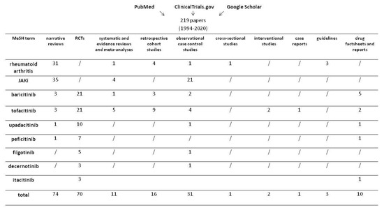A literature research was conducted using PubMed, ClinicalTrials.gov, and Google Scholar databases, searching for the medical subject headings (MeSH) terms “rheumatoid arthritis”, “JAK-inhibitors”, “baricitinib”, “tofacitinib”, “upadacitinib”, “peficitinib”, “filgotinib”, “decernotinib”, and “itacitinib”. A total of 219 papers, written in English and published between 1994 and 2020 and pertinent to the purpose of the review, were selected. They included narrative reviews (n. 74), RCTs (n. 70), systematic and evidence reviews and meta-analyses (n. 11), retrospective cohort studies (n. 16), observational case control studies (n. 31), cross-sectional and interventional studies (n. 1 and n. 2, respectively), case reports (n. 1), guidelines (n. 3), and drug factsheets and reports (n. 10) (Figure 1). Results are presented and discussed in the next sections.