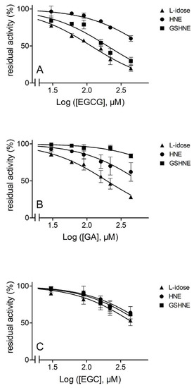 At these inhibitor concentrations, the residual activity measured for HNE reduction (IC50 709 µM, 622–808, 95% CLs) was still 80–90% of the activity value measured in the absence of EGCG (Figure 1A). Thus, in these conditions, a comparable significant (p < 0.0001) ARDI action for the reduction of both L-idose and GSHNE with respect to HNE was exerted by EGCG.