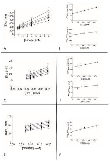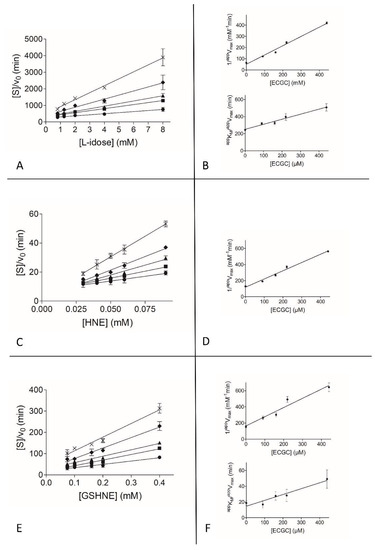 Kinetic characterization of EGCG as an AKR1B1 inhibitor. Panel (A), Panel (C), and Panel (E) are the Hanes-Woolf plots obtained when the activity of the purified enzyme (8 mU) was measured at the indicated concentrations of L-idose, HNE, and GSHNE as substrates, in the absence (●) or in the presence of the following inhibitor concentrations: (■) 90 µM, (▲) 160 µM, (♦) 220 µM, (×) 440 µM. Panel (B), Panel (D), and Panel (F) refer to the secondary plots of the slopes (1/appVmax) and the ordinate intercept (appKM/appVmax) of the relative primary plot, as a function of the inhibitor concentration. Panel (A) and Panel (B) refer to l-idose; Panel (C) and Panel (D) refer to HNE; Panel (E) and Panel (F) refer to GSHNE. Error bars (when not visible are within the symbol size) represent the standard deviations of the mean from at least three independent measurements.