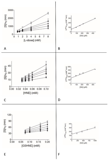 Kinetic characterization of GA as an AKR1B1 inhibitor. Panel (A), Panel (C), and Panel (E) are the Hanes-Woolf plots obtained when the activity of the purified enzyme (8 mU) was measured at the indicated concentrations of L-idose and HNE as substrates, in the absence (●) or in the presence of the following inhibitor concentrations: (■) 90 µM, (▲) 160 µM, (♦) 220 µM, (×) 440 µM. When GSHNE was used as a substrate, symbols refer to the following inhibitor concentrations: (●) zero, (■) 220 µM, (▲) 440 µM, (♦) 670 µM, (×) 1000 µM. Panel (B), Panel (D), and Panel (F) refer to the secondary plots of the slopes (1/appVmax) and the ordinate intercept (appKM/appVmax) of the relative primary plot, as a function of the inhibitor concentration. Panel (A) and Panel (B) refer to l-idose; Panel (C) and Panel (D) refer to HNE; Panel (E) and Panel (F) refer to GSHNE. Error bars (when not visible are within the symbol size) represent the standard deviations of the mean from at least three independent measurements.