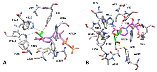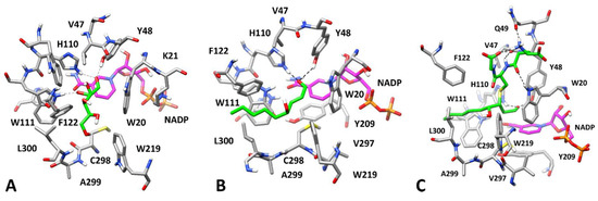 As shown in Figure 6B, HNE forms the two expected H-bonds with the catalytic residues Y48 and H110, placing the lipophilic chain inside the specificity pocket mainly delimited by L300, W110, and F112, in which hydrophobic interactions with these residues strongly stabilize the ligand binding. No substantial interactions were detected for the hydroxyl group of HNE during the MD. In fact, the presence of the hydroxyl group at C4 does not appear to be critical for the enzyme activity as shown for trans-2-nonenal, which is a very good substrate for AKR1B1 with a specificity constant that is twice as high as that measured for HNE [44].