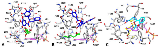 These results are also consistent with the binding mode into the AKR1B1 catalytic site of the known ligand nitazoxanide (PDB code 3V35), which was demonstrated to bind to the ESI complex in the presence of GAL. This compound could not be co-crystallized with AKR1B1 in the presence of the substrate; however, an X-ray complex obtained in the presence of dimethylformamide (Figure 8C) showed a binding mode in which the inhibitor is localized above the anion binding pocket, in a similar portion of the catalytic site to the one occupied by EGCG in our predicted ESI complexes.