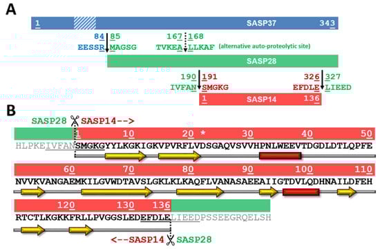 Schematic representation of SASP37, SASP28, and SASP14 forms. (A) Schematic representation of SASP37, SASP28, and SASP14 forms is shown. A transmembrane domain (F56-E77) at the N-terminal region of SASP37 is shown by a dashed box based on literature data [1,2]). SASP37 numbering was used to label boundaries of different ASPRV1 forms and processing site sequences. (B) Sequence and predicted secondary structure is shown for SASP14, using SASP14 numbering (S1-E136). Asterisk indicates the catalytic aspartate of the consensus active site motif. The N- and C-terminal processing sites are underlined [1]. Predicted secondary structure is also indicated, yellow arrows indicate β-strands, while red boxes indicate α-helices.