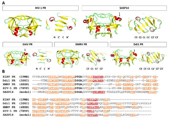 Homology modeling revealed that SASP14 shares its overall fold with the retroviral proteases (Figure 2A), and resembles the main structural features of Ddi1 and Ddi2 proteases (Figure 2B), including (i) the presence of an additional helical insert in the proximity of the active site motif, (ii) the six-stranded dimer interface that consists of only C-terminal β-strands, (iii) the active site motif, and (iv) the sequence motif of the consensus helix. The overall structural characteristics imply higher similarity with retroviral-like proteases rather with retroviral proteases, e.g., HIV-1 PR. In agreement with this, the above mentioned features highly resemble those of predicted for the Saccharomyces cerevisiae retrotransposon Ty1 protease [37] and for the human retrotransposon-derived paternally expressed gene 10 (PEG10) retroviral-like protease [50], which implies similar structural characteristics for eukaryotic retroviral-like proteases.
