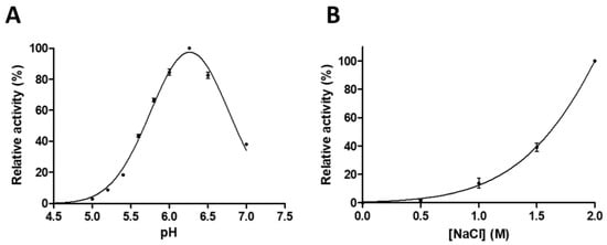 GST-SASP14 catalytic activity depends on pH and ionic strength. Enzyme activity was measured at increasing (A) pH (n = 2) or (B) ionic strength (n = 3). We used HPLC detection of substrate cleavage as described in Materials and methods. Values in parentheses represent the number of independent experiments. Error bars represent SD.