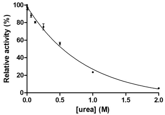 Dependence of GST-SASP14 activity on urea concentration. Enzyme activity was measured at increasing urea concentration. We used HPLC-based detection of substrate cleavage as described in Materials and methods. Error bars represent SD (n = 2).