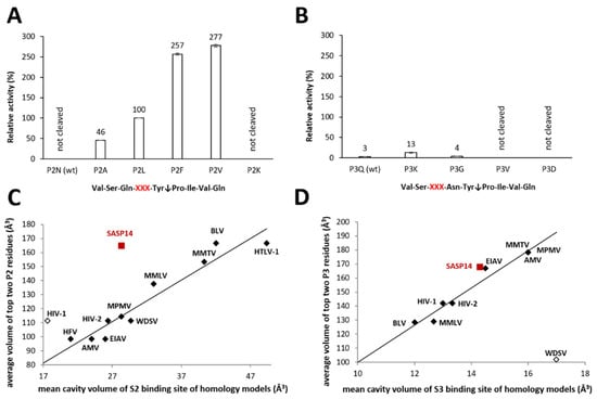 P2- and P3 residue preferences of GST-SASP14. The synthetic oligopeptides used for activity measurements represented wild-type and P2- or P3-modified variants of HIV-1 MA/CA (VSQNY↓PIVQ) cleavage site, modified positions are indicated by XXX. Relative activities were determined for the wild-type substrate and for its P2- (A) and P3-modified variants (B) by incubating reaction mixtures for 1 and 16 h, respectively. Activity determined for P2-Leu variant was considered to be 100%. Error bars indicate SD (n = 2). Figure part (C,D) was prepared in part based on previously published data [24,25]: the average volumes of two residues for which the measured relative activity was the highest are plotted against the mean cavity volumes of S2 (C) and S3 subsites (D) of various retroviral proteases. Values determined for SASP14 are shown by red squares, values of previously published dataset are shown by diamonds. The black symbols show values that were used for correlation, while opened diamonds indicate values excluded from the former analysis. For SASP14, average residue volumes of top P2 residues (Phe and Val) of the cleaved substrates are shown (C), whereas volume of Lys is plotted against the mean cavity volume of P3 binding site (D). Additionally, compositions of the S2 and S3 substrate-binding cavities are shown in Table S2.