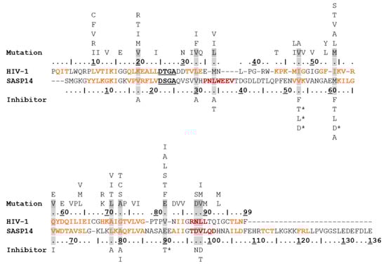 Residues of SASP14 corresponding to resistance mutations of HIV-1 PR. Aligned sequences of HIV-1 and SASP14 proteases are coloured according to secondary structural organization (based on crystal structure and prediction, respectively): β-sheets are orange, and α-helices are red. Alignment with other proteases are shown in Figure 2. The catalytic motif residues are bold and underlined in the sequences. Resistance mutations of HIV-1 PR are shown above the sequence based on Weber et al. [49]. The resistance mutation residues of HIV-1 PR that can be observed at the equivalent positions of SASP14 are highlighted by grey background. Asterisks mark those inhibitors for which the highlighted mutations are considered to be major resistance mutations in HIV-1 PR. Inhibitor names are abbreviated as follows: A-atazanavir, D-darunavir, F-fosamprenavir, I-indinavir, L-lopinavir, N-Nelfinavir, and T-tipranavir.