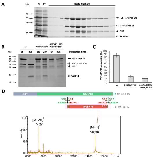 We also observed that GST-SASP28 enzymes undergo autoproteolysis during expression and purification, as it is represented in the example of GST-SASP28 in Figure 10A. After autoproteolysis of wild-type GST-SASP28, MALDI-TOF-MS analysis was performed. The good agreement of calculated and measured molecular weights proved that SASP14 is released from the precursor by cleavages at the known N- and C-terminal cleavage sites (Figure 10C).
