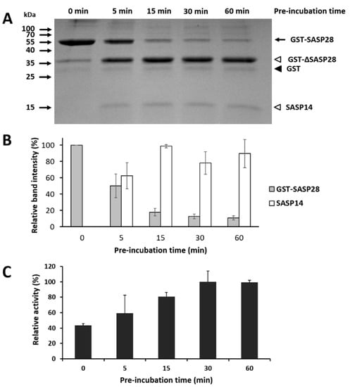 Therefore, in our experiments we investigated ASPRV1 autoactivation in samples containing SASP28 and SASP14 in different ratios. To ensure self-processing and release of SASP14, the GST-SASP28 precursor was pre-incubated up to 60 min at 37 °C, and processing of the precursor was monitored by SDS-PAGE. We found that the GST-SASP28 precursor was the most prevalent enzyme form prior to the incubation, while the processed SASP14 was absent from the sample (Figure 11A). Based on band intensities, during incubation the amount of GST-SASP28 precursor decreased, while SASP14 was released by autoproteolysis (Figure 11B).