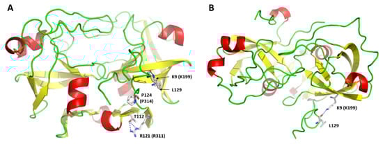 We assume that impaired abilities of variants for self-processing [8] may be caused by structural changes rather than by the mutations of autoproteolytic cleavage sites sequences, because K199, R311, and P314 residues are located in P9′, P16, and P13 positions, respectively. Thus, point mutations at these positions are unlikely to prevent productive binding of the substrate by the introduction of unpreferred residues relatively distant from the cleavage site. We observed the proximity of N- and C-termini in the modeled enzyme-substrate complex while investigating interactions of P3 residue with the enzyme (Figure S5), and found that K9 residue is also located close to the C-terminal extended region and may interact with a C-terminal residue (Figure 12B). R121 residue was predicted to form H-bond making interaction between the 2nd and 3rd β-strands of the dimer interface (Figure 12A). Both literature data [8] and the proposed model imply that K199, R311, and P314 residues may contribute to conformational integrity of the ASPRV1. Additionally, the mutation-induced changes that affect proteolytic activity highlight the potential importance of the terminal extensions which are characteristic for retroviral-like but not for most retroviral proteases [30]. Experimental approaches need to be used to determine the roles of these residues and reveal how mutations influence structural characteristics of the N- and C-termini, the dimer interface, or the overall domain.