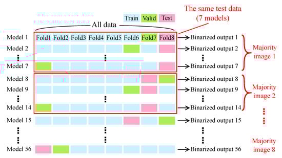 After the training of the model, ensemble learning (majority voting strategy) and a median filter were applied to further improve the performance. Figure 2 shows an overview of ensemble learning. After the eight-fold nested cross validation with CARS rigid endoscopy images, a total of 56 models with different weight sets (Models 1–56) were provided. The 56 models were divided into eight groups (a group is surrounded with a red box). The seven models in each group were trained with the same dataset, where the combination of training and validation sets was different. A final output of an ensemble model was decided by a majority decision of the seven binarized outputs pixel by pixel (Majority images 1–8) and filtered by a median filter with a 37 × 37 kernel.