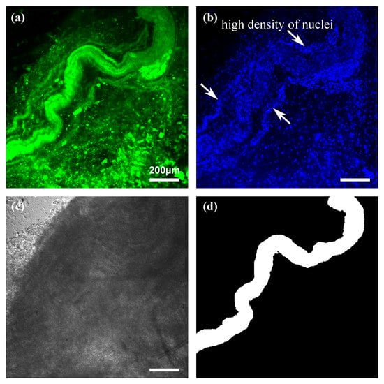 Confocal fluorescence microscopy imaging of rabbit peri-prostatic nerve. (a) FluoroMyelin Green image. (b) Hoechst image. (c) Transmission image. (d) Ground truth image prepared based on fluorescence images. Scale bar is 200 m.