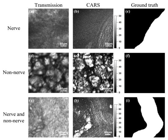 Figure 4 shows the results of CARS endoscopic imaging of the non-labeled rabbit peri-prostatic fascia. The left, center, and right columns show the transmission images (Figure 4a,d,g), the CARS rigid endoscopy images (Figure 4b,e,h), and the ground truth images (Figure 4c,f,i), respectively. Bright fibrous structures are shown in Figure 4b, but not in Figure 4a. In Figure 4d,e, bright spherical structures appear. Figure 4h presents both bright fibrous and spherical structures. We considered that the bright fibrous structures indicated nerves, and the spherical structures indicated non-nerve tissues. In transmission images for CARS endoscopy (Figure 4a,g) as well as fluorescence microscopy (Figure 3c), the nerves are unclear since nerves are almost transparent. It is found that the contrast enhancement of nerves is needed to identify nerve positions. Figure 4c,f,i are ground truth images for nerve segmentation, where white pixels indicate nerves.