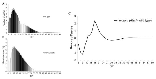 Typical chain length distribution (CLD) profiles of starches from Arabidopsis thaliana analyzed by HPAEC-PAD. (A) and (B) CLD profiles from wild type and Atss1 mutant. Plants were grown in a 12 h light/12 h dark cycle and leaves were harvested at the end of the light period. The isolated starches were digested with isoamylase to degrade the α 1,6 linked branching points within the amylopectin. (C) Difference plots were obtained by subtraction CLD profile of wild type from mutant CLD. Differences of mean values are presented. DP—degree of polymerization.