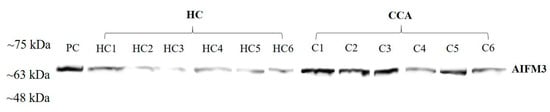 The validation of apoptosis-inducing factor, mitochondrion-associated 3 (AIFM3) expression in serum samples. AIFM3 was investigated by Western blot analysis; PC = positive control, HC = healthy control, C = CCA.
