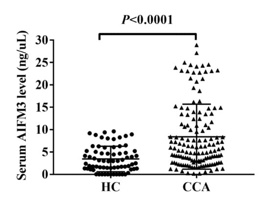 AIFM3 protein is distributed in mitochondria and cytosol, but mature AIFM3 protein lacks a signal peptide. Thus, whether it can be secreted in plasma/serum or its serum levels in health and disease remains unclear. The aims of this study are to determine the AIFM3 expression levels in the sera of CCA patients and controls and to evaluate whether it could be a potential diagnostic/prognostic biomarker of CCA.