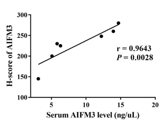 As presented in Figure 1, serum AIFM3 levels were notably low in the HC group and were markedly high in some patients with CCA. Thus, we examined whether AIFM3 produced and released from CCA cells is a major source of serum AIFM3. Among 141 serum samples of CCA patients, 7 cases have immunohistochemical staining of AIFM3 in CCA tissues in our previous research [9]. The graded staining intensity of those 7 specimens were from the previous study [9]. Then, correlation between the serum AIFM3 levels and AIFM3 expression in the corresponding CCA tissue was examined. The results show that serum AIFM3 levels were correlated with tissue AIFM3 expression, suggesting that serum AIFM3 is mainly derived from CCA tissues (Figure 4).