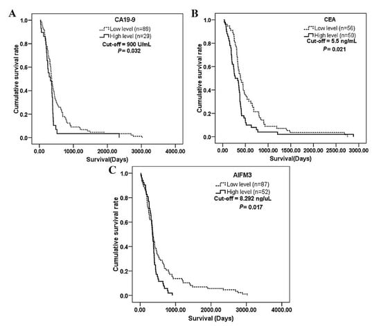 Correlation between serum AIFM3, carcinoembryonic antigen (CEA) and carbohydrate antigen 19-9 (CA19-9) levels and the survival of CCA patients. CCA patients were divided into high and low (A) serum CA19-9, (B) CEA, and (C) AIFM3 groups using the cut-off values of CA19-9 (900 U/mL), CEA (5.5 ng/mL), and AIFM3 (8.292 ng/uL), respectively using Cutoff Finder [17]. Kaplan–Meier curves showing overall survival (OS) of CCA patients having high (solid line) and low (dashed line) serum levels. Significant difference in the survival time was observed between high and low AIFM3 level groups (log-rank test p-value = 0.017).