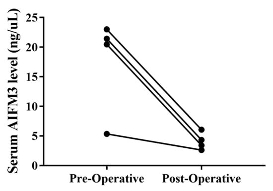 To ensure whether AIFM3 can be a prognostic marker for CCA patients, although this is a preliminary study with small sample size, serum AIFM3 levels were measured for the paired pre- and post-operative sera of 4 CCA patients. As shown in Figure 6, serum AIFM3 level of all 4 CCA patients was significantly decreased (p = 0.032) after surgery.