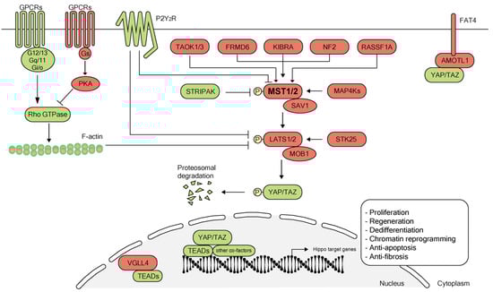 Overview of the Hippo pathway. The canonical Hippo signaling pathway is a complex network of proteins: mammalian sterile 20-like (MST) kinases 1/2, the adaptor proteins Salvador homolog 1 (SAV1), large tumor suppressor (LATS) kinases 1/2, Mps one binder kinase activator protein (MOB1), the downstream transcription cofactors Yes-associated protein 1 (YAP1) and its paralog transcriptional co-activator with PDZ-binding motif (TAZ, also known as WWTR1). When Hippo signaling is on (shown in red), kinases MST1/2 and SAV1 complex, phosphorylate and activate kinases LATS1/2. LATS1/2 interacts with the adaptor MOB1 to phosphorylate YAP and its analog TAZ. YAP/TAZ undergo ubiquitination and degradation after phosphorylation. When Hippo signaling is off (shown in green), YAP/TAZ as transcriptional co-activators translocate into the nucleus and interact with TEA domain family members (TEADs) and other co-factors such as SMAD family members (SMADs), β-Catenin, pituitary homeobox 2 (PITX2), forkhead box protein O1 (FOXO1), T-box transcription factor TBX5 and Runt-related transcription factor 1/2 (RUNX1/2) to regulate gene transcription for cellular proliferation, regeneration, dedifferentiation, apoptosis and chromatin reprogramming. Transcription cofactor vestigial-like protein 4 (VGLL4) competes directly with YAP for the binding of TEADs in the nucleus [56,57,70]. Hippo pathway activity also can be regulated by several upstream proteins such as kidney and brain expressed protein (KIBRA), neurofibromin 2 (NF2), FERM domain-containing protein 6 (FRMD6), mitogen-activated protein kinase kinase kinase kinases (MAP4Ks), striatin-interacting phosphatases and kinases (STRIPAK), serine/threonine-protein kinase 25 (STK25), Ras-associated domain family 1 isoform A (RASSF1A), thousand-and-one amino acid kinases 1/3 (TAOK1/3), P2Y2 nucleotide receptor (P2Y2R), protocadherin Fat4 (FAT4) and G-protein-coupled receptor signaling (GPCR). PKA, protein kinase A; AMOTL1, angiomotin-like protein 1.