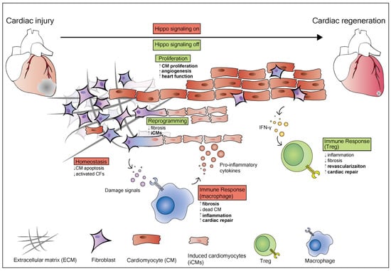The role of the Hippo pathway in heart regeneration and homeostasis. The Hippo pathway plays different roles in different cardiac cell types. When Hippo signaling is on (shown in red), it maintains heart homeostasis and inhibits CM apoptosis and activated CFs. After an injury, the damaged area in the heart consists of dead cardiomyocytes, activated cardiac fibroblasts, extracellular matrix (ECM), and immune cells including macrophages and T-regulatory (Treg) cells. When the heart is injured, the homeostasis of the heart is destroyed. Damage signals induce an immune response that activates resident macrophages, which release pro-inflammatory cytokines to induce inflammation and fibrosis. Resting cardiac fibroblasts induced into activated CFs and myofibroblasts, then activate CFs which promotes fibrosis in the damaged area. Cardiac fibroblasts activation also can be achieved through inhibition of the Hippo pathway. In cardiomyocytes, Yap activation induces cardiomyocytes to re-enter the cell cycle and proliferate when Hippo signaling is off (shown in green). YAP5SA overexpression promotes the generation of new cardiomyocytes and reorganizes chromatin accessibility to a proliferative fetal-like state. In epicardial cells, the Hippo pathway promotes the secretion of cytokines such as interferon-γ (IFNγ), which recruits T-regulatory (Treg) cells. Treg cells inhibit inflammation and fibrosis, promote cardiac repair and revascularization.