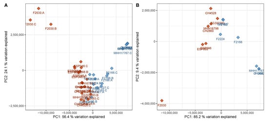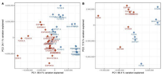 Figure 4. PCA scores plot of the discovery data set with only virulence-associated secondary metabolites included into the calculation. The plot has been created analogously to Figure 1 and shows a comparably good separation between the two phenotypes based on virulence-associated secondary metabolites only. (A) Data on sample level, (B) data on strain level (cf. Figure 1). Red—virulent cluster A strains, blue—avirulent cluster B strains.
