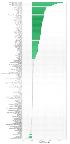 Figure 2. Regulation of identified metabolites in the discovery data set. The binary logarithm of their (non-directional) fold change was plotted on the x-axis for all identified metabolites. Features exhibiting a fold change ≥ 1.5 and a corrected p-value ≤ 0.05 were coloured in green.