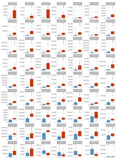 Figure 3. Box plots of identified metabolites in the discovery data set. Data distribution for all identified metabolites with an absolute fold change of ≥ 1.5 are shown as box plots. For each metabolite, one boxplot shows the abundances in each group. Red—virulent cluster A strains, blue—avirulent cluster B strains.