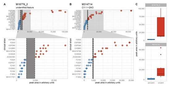 Figure 5. Levels of the two non-overlapping features in the discovery data set. (A,B) Peak area in arbitrary units is plotted on the x-axis for the two perfectly separating features M187T6_2 (A) and M314T14 (B). Full range of the x-axis is shown in the top panels and an enlarged region of the lower x-axis range is depicted in the lower panels. Non-overlapping spaces are marked by dashed lines and grey shading. The difference between the lowest level in the virulent cluster A group und the highest level in the avirulent cluster B group is a lot more pronounced for M187T6_2. (C) Peak area in arbitrary units is plotted on the y-axis for the two perfectly separating features M187T6_2 and M314T14 as box plots to visualize data distribution. Red—virulent cluster A strains, blue—avirulent cluster B strains.