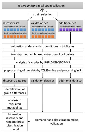 Untargeted LC-MS metabolomics data were recorded and analysed for 35 P. aeruginosa clinical strains differing in their virulence as determined by a G. mellonella survival model and their biofilm phenotype which was categorized into the three main clusters A, B and C [15]. A total of 14 strains, seven virulent strains with a cluster A biofilm phenotype and seven avirulent cluster B strains, constituted the discovery data set, that was analysed in depth for metabolomic differences between the phenotypes and used to build a random forest classification model. Another 14 strains equally split between the two phenotypic groups represented in the discovery group served as the validation data set. These strains were used to test the model constructed from the discovery data set. An additional seven virulent strains corresponding to a tertiary cluster C biofilm phenotype—i.e., a phenotype which was not present in the discovery data set—were used to investigate whether our classification model is capable of predicting virulence in a biofilm phenotype independent manner. All strains were cultivated in rich medium under standard planktonic conditions, extracted using a methanol-based protocol, separated on a reversed-phase C18 column and detected using time-of-flight mass spectrometry following electrospray ionization in positive mode (ESI-QTOF-MS). The study design is visualized in Scheme 1.