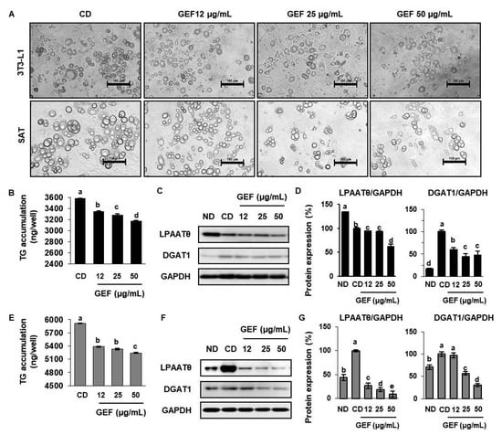 Effects of GEF on lipid droplet morphology and triglyceride synthesis in 3T3-L1s and SATs. (A) Cell morphology was evaluated by optical microscopy (400×). Adipocytes were differentiated for 16 days. Scale bar: 100 µm. (B,E) The intracellular triglyceride (TG) content of 3T3-L1s and SATs treated with GEF, measured using a TG ELISA kit. (C,D) Expression of lipogenic proteins (LPAATθ and DGAT1) in 3T3-L1s. (F,G) Expression of lipogenic proteins in SATs. Data are expressed as mean ± SD (n = 4). Treatments with different letters were significantly different, p < 0.05 (a > b > c > d).