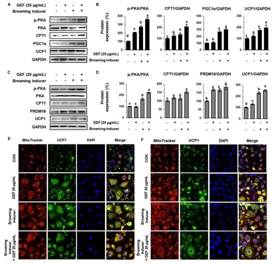 To evaluate the effect of GEF on thermogenesis, we compared 25 µg/mL GEF-treated cells with white adipocytes treated with well-known inducers of browning (50 nM triiodothyronine and 1 µM rosiglitazone). As shown in Figure 5A–D, 3T3-L1s and SATs treated with the browning inducers showed higher expression of p-PKA, CPT1, and thermogenic biomarkers (PGC1α, PRDM16 and UCP1). GEF further increased the expression of p-PKA and these proteins in cells treated with browning inducers. Furthermore, staining of both types of adipocytes with MitoTracker Red, and immunostaining with FITC-conjugated anti-UCP1 antibody, showed that the cytoplasmic staining intensities were increased by treatment with both the established inducers of browning and GEF (Figure 5E,F). Although there was no additive effect of thermogenic proteins, GEF treatment was as effective as browning inducer treatment. This implies that GEF increases mitochondrial activity and the expression of UCP1, which is consistent with a browning effect of GEF.