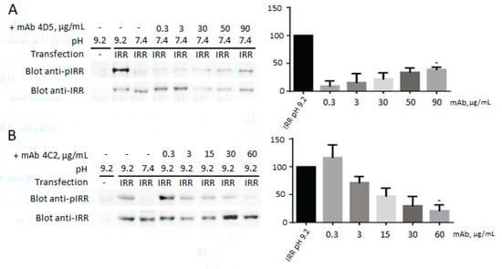 Activation and inhibition of IRR by monoclonal antibodies. For each antibody the IRR phosphorylation level at pH 9.2 is indicated as 100%. Transfected cells were incubated with different concentrations of antibodies from 0.3 to 90 µg/mL. Lysates of transfected cells were directly analyzed by Western blotting with anti-pIRR antibodies and after stripping with anti-IRR antibodies. For the quantitative analysis of Western blots, we used Fusion Solo system (Vilber Lourmat, Collégien, France). The ratio of integral density of the phosphorylated receptor (pIRR signal) to the total receptor (IRR antibody signal) was plotted versus antibody concentration. Values are means ± SE (n ≥ 4). Asterisks indicate p < 0.05. (A) Incubation of the IRR-expressing HEK293 cells with 4D5 antibodies at рН 7.4 leads to IRR phosphorylation. (B) Incubation of the IRR-expressing HEK293 cells with 4C2 antibodies at рН 9.2 leads to the inhibition of the IRR activation by alkali.