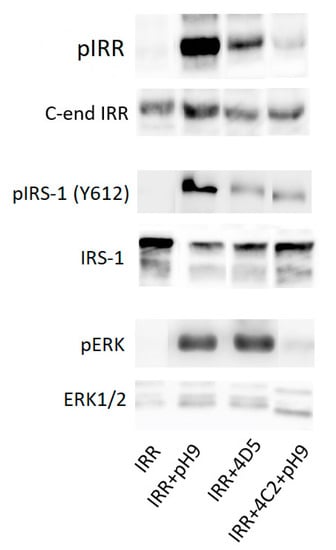 Moreover, 4D5 antibody activates not only the IRR itself, but two downstream signaling adapters—IRS-1 and ERK1/2—while 4C2 antibody treatment in alkaline media results in the inhibition of both these pathways (Figure 3). Notably, it was previously shown that ERK1/2 is not activated during the alkaline treatment of IRR-transfected CHO cells [], whereas here we demonstrate that in HEK293 cells ERK activation occurs both in the case of alkali and 4D5 antibody treatment.