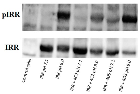 We also studied the influence of 4D5 and 4C2 antibodies on IRR activation at pH 7.4 and 9.0. Therefore, incubation of the IRR-expressing HEK293 cells with 4C2 antibody at neutral pH has no effect, but if such incubation is followed by the change of pH to 9.0, 4C2 partially inhibits IRR activation (Figure 4). In the case of the 4D5 antibody, as it was stated before, incubation of the IRR-expressing HEK293 cells with this mAb at neutral pH leads to the partial activation of IRR. If such incubation is followed by the change of pH to 9.0, the level of phosphorylated IRR is significantly higher than in case of separate treatment of cells with alkaline pH or 4D5 antibody (Figure 4). This result indicates synergism of alkaline media and 4D5 antibody effects on IRR activation.
