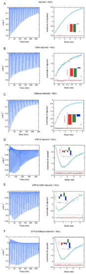 Isothermal Titration Calorimetry (ITC) of Ni(II) over HpUreG and its variants in the presence and in the absence of GTPγS in the sample cell. The panels on the left report the heat flow response for the injections of the metal ion over the protein solutions. The panels on the right show the respective integrated heat data (blue circles) and their best fit obtained using a single set of binding sites (A–C) or a model involving protein dimerization upon metal binding (D–F); the insets show the binding signatures (ΔG, ΔH, −ΔT, ΔS) associated to each curve; the bottom plots show the residuals of the fitting procedure.