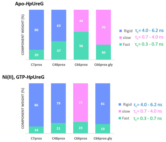 Note that, in the following paragraphs, we named “fast” all spectral components characterized by τc values included between 0.3–0.7 ns, “slow” those characterized by τc values included between 0.7–4.0 ns, and “rigid” components characterized by τc values included between 4.0–6.2 ns. The sharpest EPR line shape is observed for the nitroxide grafted to Cys66. This spectrum is constituted by two components having almost the same proportion, one with τc = 0.6 ns (“fast”) and the other with τc = 2.4 ns (“slow”) (Table 2 and Figure 3). The fact that the “fast” component shows a mobility close to that normally observed for a spin label attached to loops or intrinsically disordered protein fragments [27,44,54] demonstrates that this region is highly flexible. This dynamic behaviour is similar to that observed for the SpUreG orthologue containing the nitroxide label grafted onto the corresponding cysteine residue, which features two conformers with similar correlation times (τc “fast” = 0.3 ns and τc “slow” = 3.6 ns) (see Figure S5) [27].