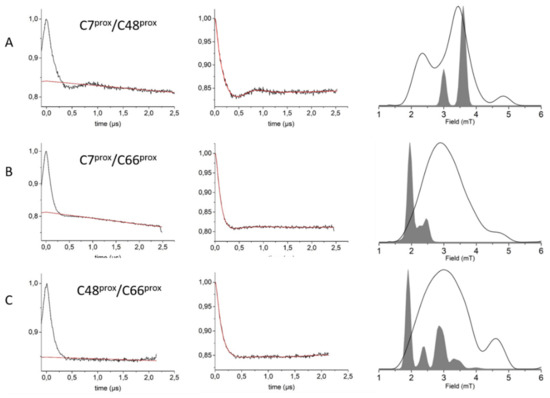 Inter-label distance distributions. (Left panel): experimental Q-band DEER traces recorded at 60 K for (A) C7prox/C48prox, (B) C7prox/C66prox, and (C) C48prox/C66prox. Red lines indicate the baseline used for background correction. (Central panel): corrected Double Electron-Electron Resonance (DEER) traces (black) with superimposed fits derived from Tikhonov regularization (red). (Right panel): Tikhonov derived distance distributions obtained using DeerAnalysis (black) [56] superimposed with distance distributions calculated by MMM software (gray curves) [34].