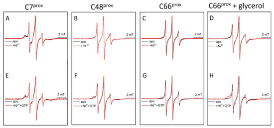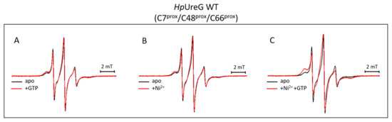 Mutants containing a single cysteine available for labeling were obtained by double mutation (“Site-directed mutagenesis” in Supplementary Materials Section S3). They were named as following: HpUreG-C7A-C48S: C66proxyl; HpUreG-C7A-C66A: C48proxyl; HpUreG-C66A-C48S: C7proxyl.